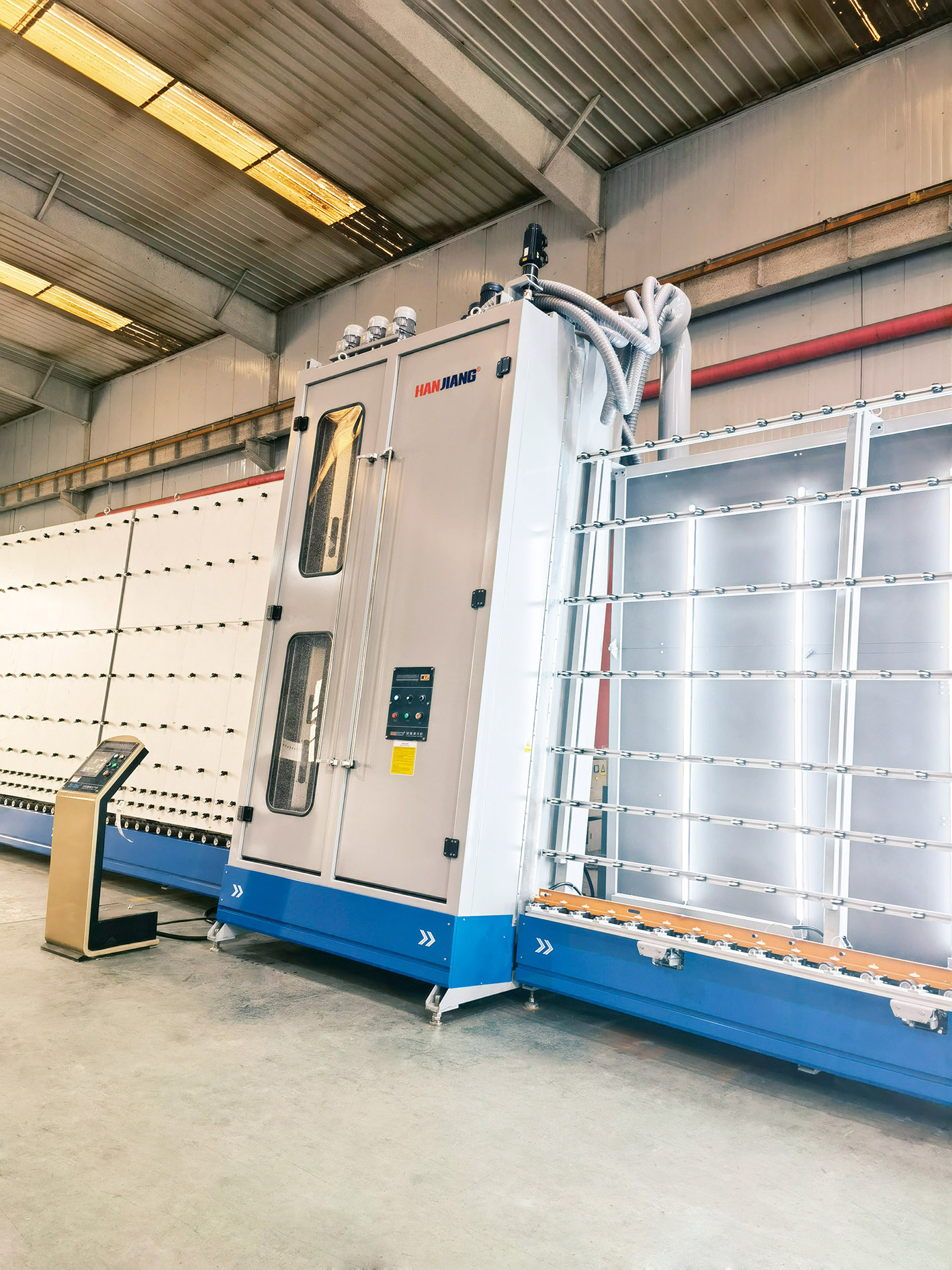 隨著當(dāng)前市場(chǎng)和社會(huì)發(fā)展,各類(lèi)品牌店、4S店、展示廳等公共項(xiàng)目對(duì)充氣型中空超大玻璃的需求日益劇增。 2021年韓江公司受?chē)?guó)內(nèi)一家知名企業(yè)委托,承接定制技術(shù)規(guī)格為:3300mm×9000mm Low-E玻璃除膜機(jī)和中空玻璃充氣生產(chǎn)線,加工單片玻璃厚度50mm,中空玻璃厚度120mm,在線充氬氣含量達(dá)到90%以上。