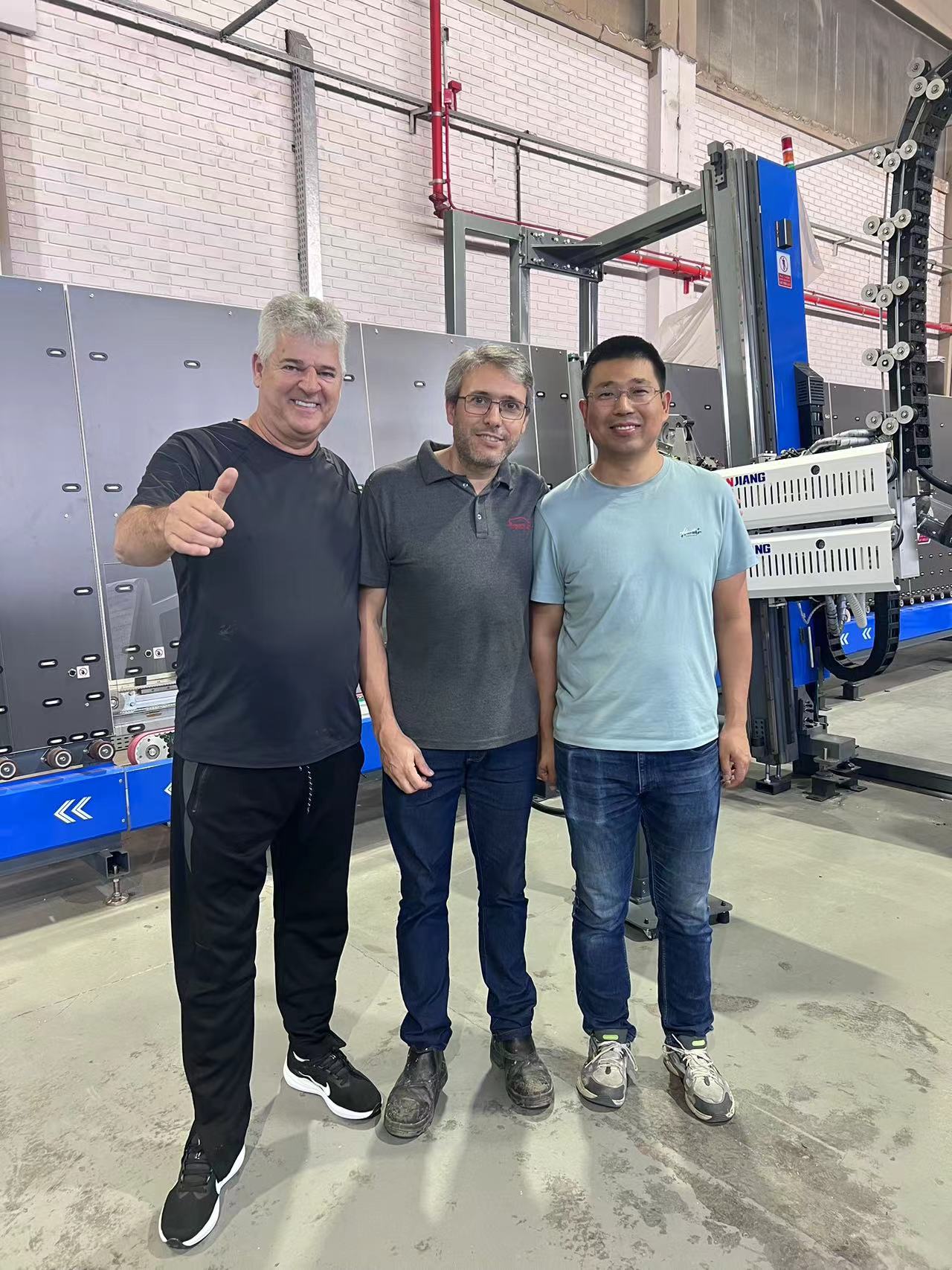然而,實(shí)現(xiàn)這一過程面臨著許多挑戰(zhàn)。要將一條從上料到下料、從清洗到框架組裝、從機(jī)器人處理Super Spacer到高速氬氣填充和壓制、高速密封的全自動生產(chǎn)線中的每個組件的周期時間同步化,需進(jìn)行精密的規(guī)劃。從設(shè)計階段的嚴(yán)格計算,到生產(chǎn)、調(diào)試、試運(yùn)行再到最終驗收,我們遇到了眾多問題。這些問題包括:玻璃上料過程的自動化、為客戶處理不同高度的玻璃架、防止玻璃在無人操作期間粘附、在上料和下料過程中匹配玻璃架的數(shù)量、在滿載情況下加速機(jī)械臂的速度以及同步整條生產(chǎn)線的速度。每一個挑戰(zhàn)都是通過韓江團(tuán)隊與我們在巴西的服務(wù)團(tuán)隊NEX的日夜協(xié)作而克服的。