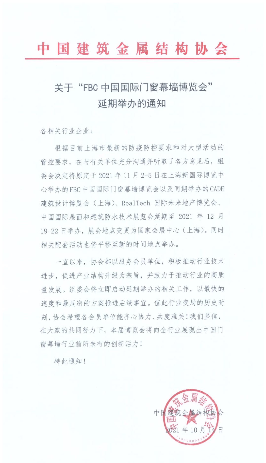 根據(jù)目前上海市最新的防疫防控要求和對(duì)大型活動(dòng)的管控要求,在與有關(guān)單位充分溝通并聽(tīng)取了各方意見(jiàn)后,組委會(huì)審慎決定:將原定于2021年11月2-5日在上?!て謻|·新國(guó)際博覽中心舉辦的FBC2021中國(guó)國(guó)際門窗幕墻博覽會(huì)延期至2021年12月19-22日舉辦。同時(shí),舉辦地點(diǎn)變更為國(guó)家會(huì)展中心(上海)。博覽會(huì)同期的各項(xiàng)會(huì)議和活動(dòng)也將平移至新的時(shí)間地點(diǎn)舉辦。