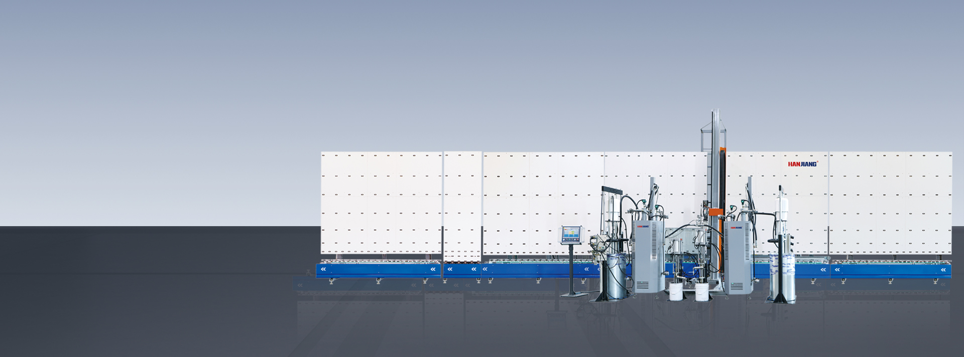 HANJIANG insulated glass sealing robot applies servo system to control the ratio of A and B sealant accurately. Advanced unique double channel continuous sealant supply system help seal large IG panel and thick sealing depth faster and fully.